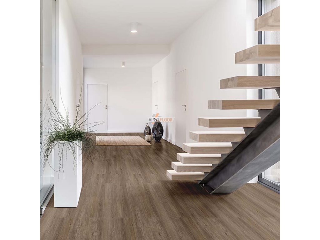 Vinylová podlaha Objectline 9872 Dub Toledo věrně napodobuje strukturu přírodního dubového dřeva s jemnou kresbou a decentními odstíny středně hnědé barvy, doplněné o světlé a tmavší tóny, které dodávají podlaze hloubku a autentičnost.